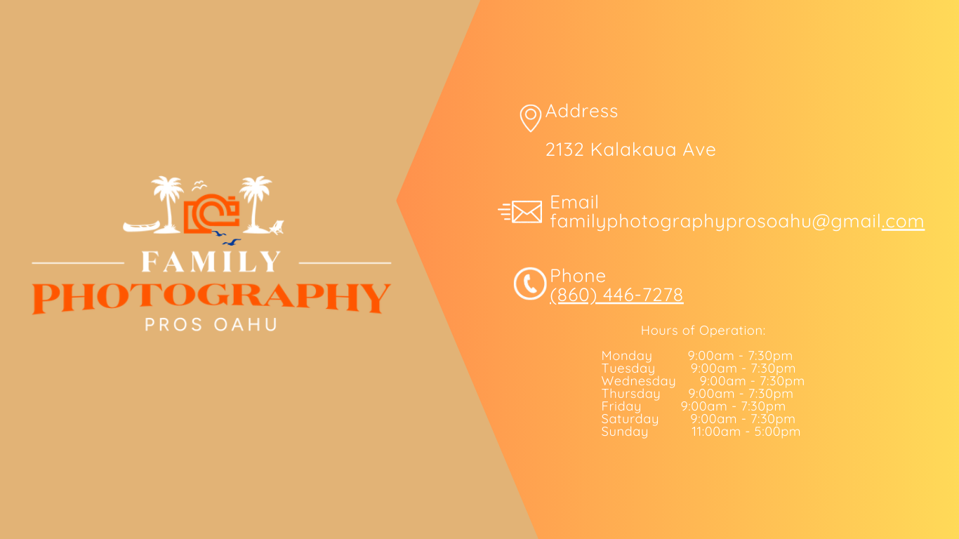 Conveniently located at 2132 Kalakaua Ave in Waikiki, Michael and his team at Family Photography Pros Oahu has proudly served families for over a decade, capturing joyful moments for geusts of Hale Koa, Twin Fin, Hilton Hawaiian Village, Westin at The Moana Surf Rider, Luana Waikiki, Kahala Resort, Halekulani and beyond.